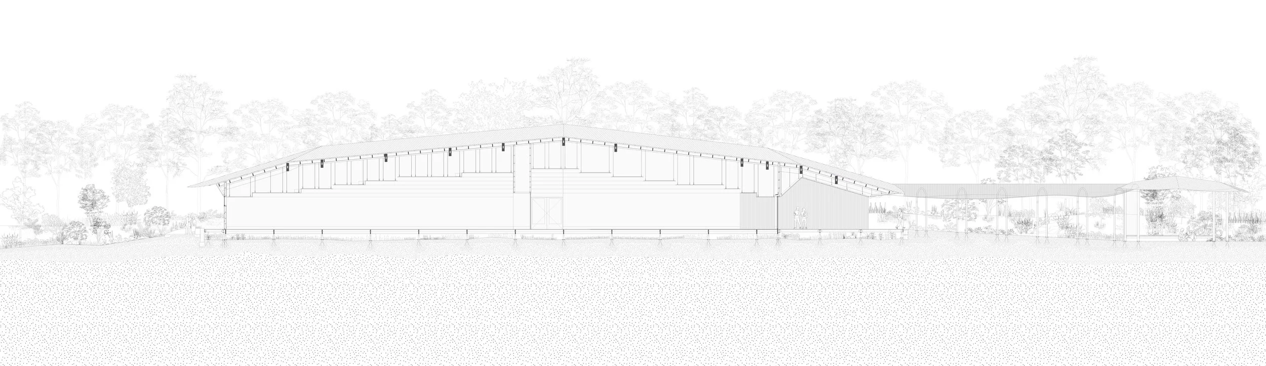 The acupuncture-like substructure and efficient timber structure allow the project to hover above the ground and let life, ground water systems and ecologies continue. The turtle feet touch the ground - expressed on the low side, impressed on the high side, allowing us to read the fall of the land across the site